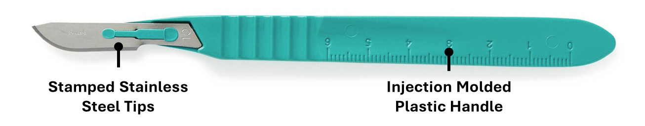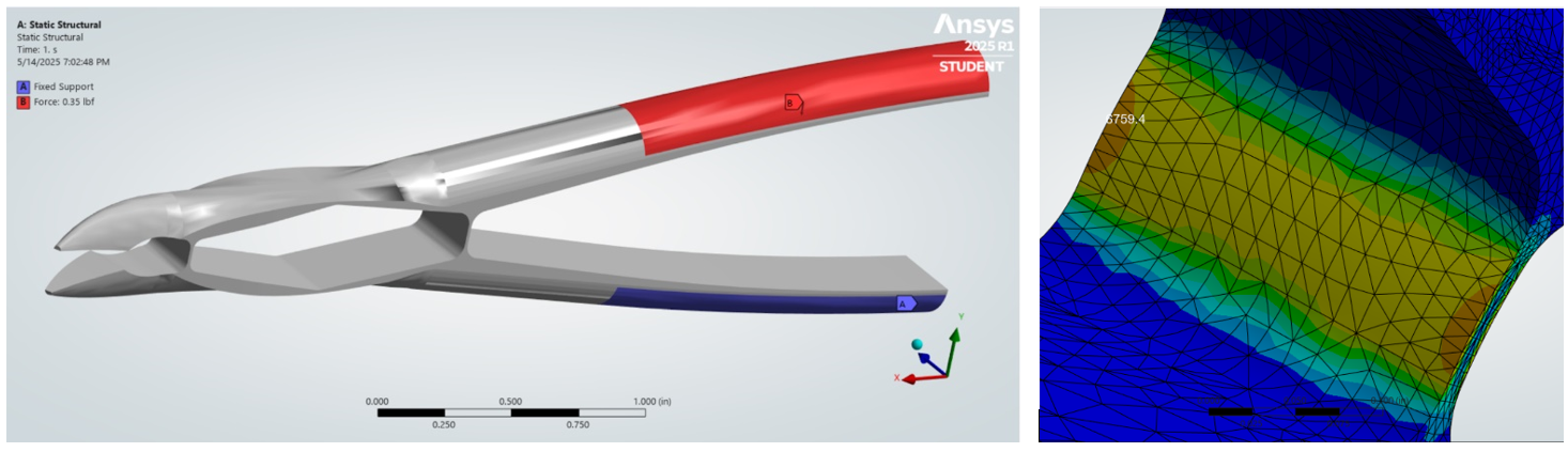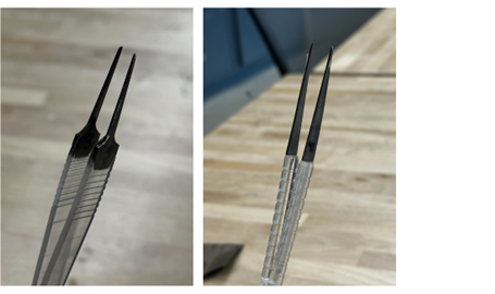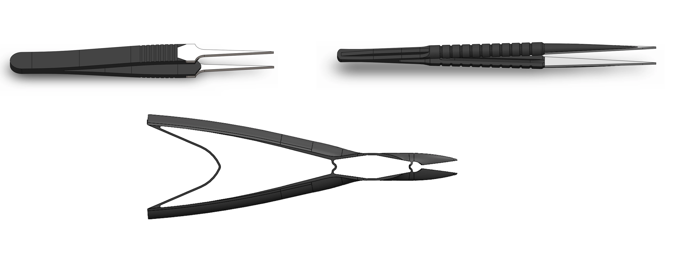 All prototypes were produced by masked stereolithography (MSLA) printing on a Formlabs Form 4, enabling rapid design iterations of handle geometries and hinge details. The printed handles were paired with hand‑finished, 410 stainless tips cut on a Fablight FL4500 to match OEM geometry and functionality. Handles and tips are joined with printed alignment features and bonded with a cyanoacrylate adhesive.