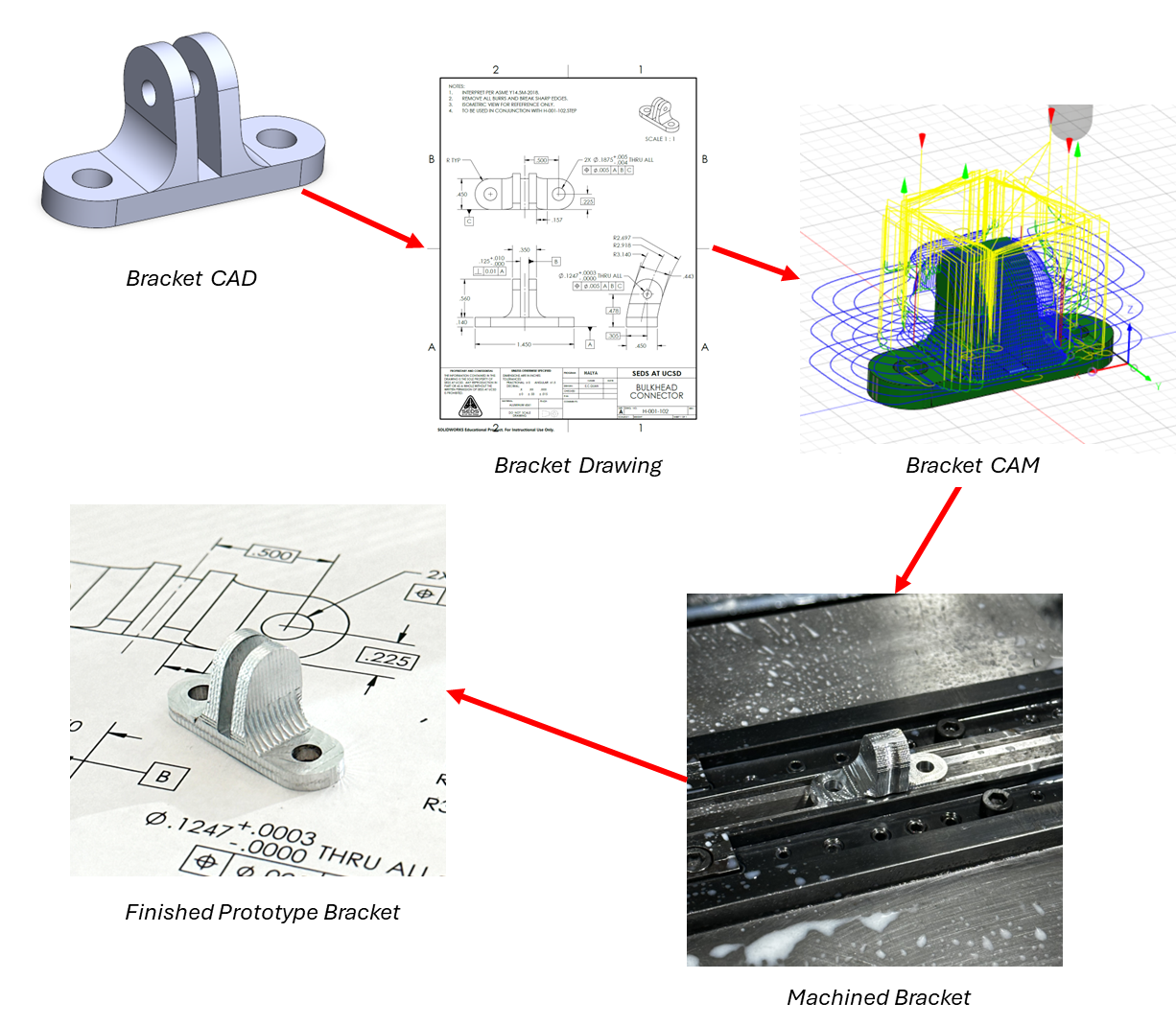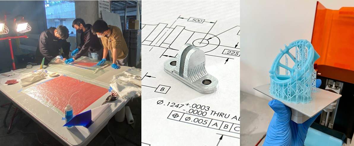 Various prototyping campaigns for Halya: composites (left), machining (center), and additive (right).