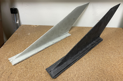 Prototype composite fins for Halya (fiberglass, left; carbon-fiber, right).